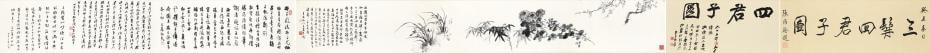 ▲LOT 3035 張大千、鄭曼青、劉延濤《三髯四君子》手卷,手卷 設色 紙本,張維翰(題):48×135.5cm、張大千(引首):48×104cm、張大千、鄭曼青、劉延濤 (畫):46×343cm、王壯為、臺靜農、陳定山(跋):46×248cm,預估價新台幣120萬至200萬。