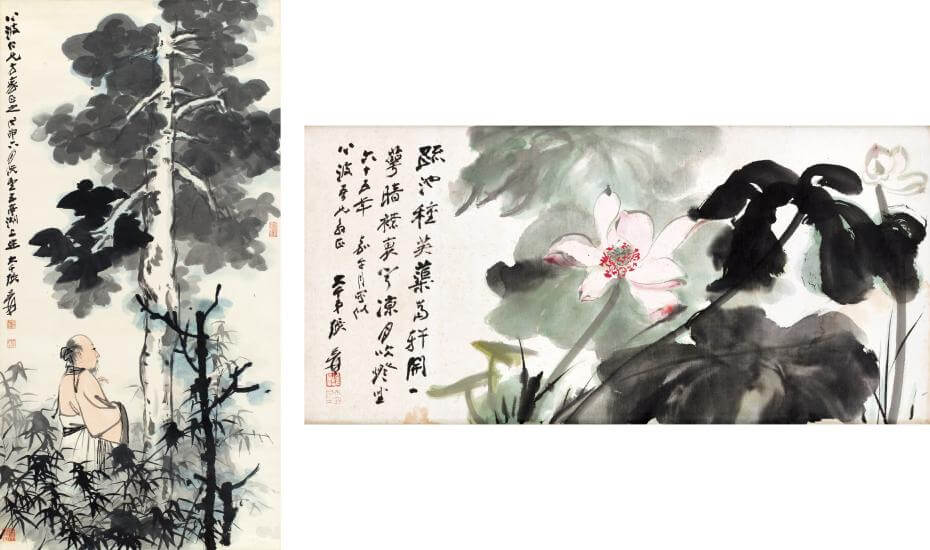 ▲LOT 3062 張大千《疏池芙蕖圖》,1976年,鏡框 設色 紙本,43×90公分,預估價新台幣150萬至250萬,上款人:心波先生(即前臺北故宮院長秦孝儀)(右)。